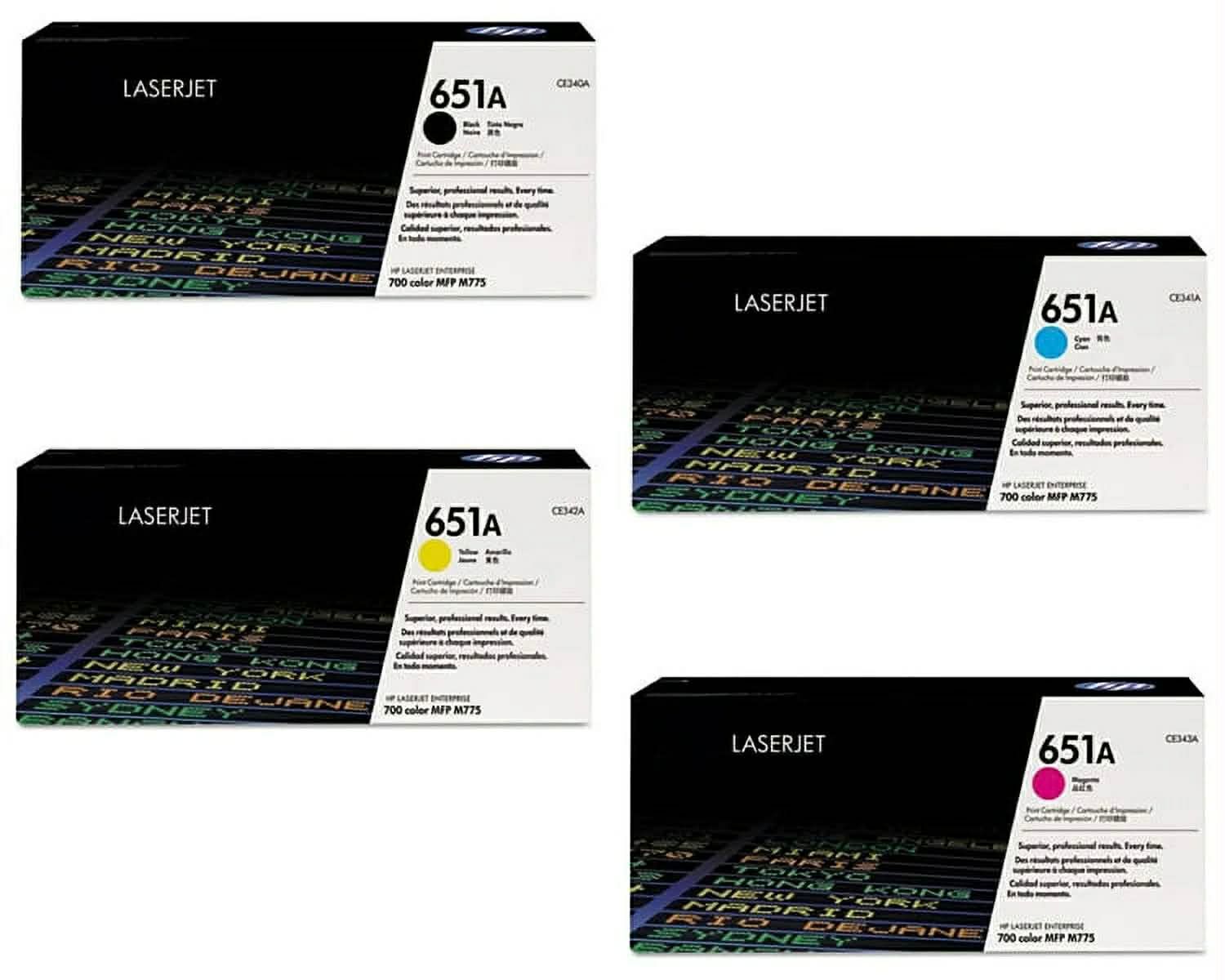 طقم حبر 651A يحتوي على أربع خراطيش ليزر بألوان (أسود – سماوي – أرجواني – أصفر)، مناسب للاستخدام اليومي والطباعة الملونة بجودة عالية.
